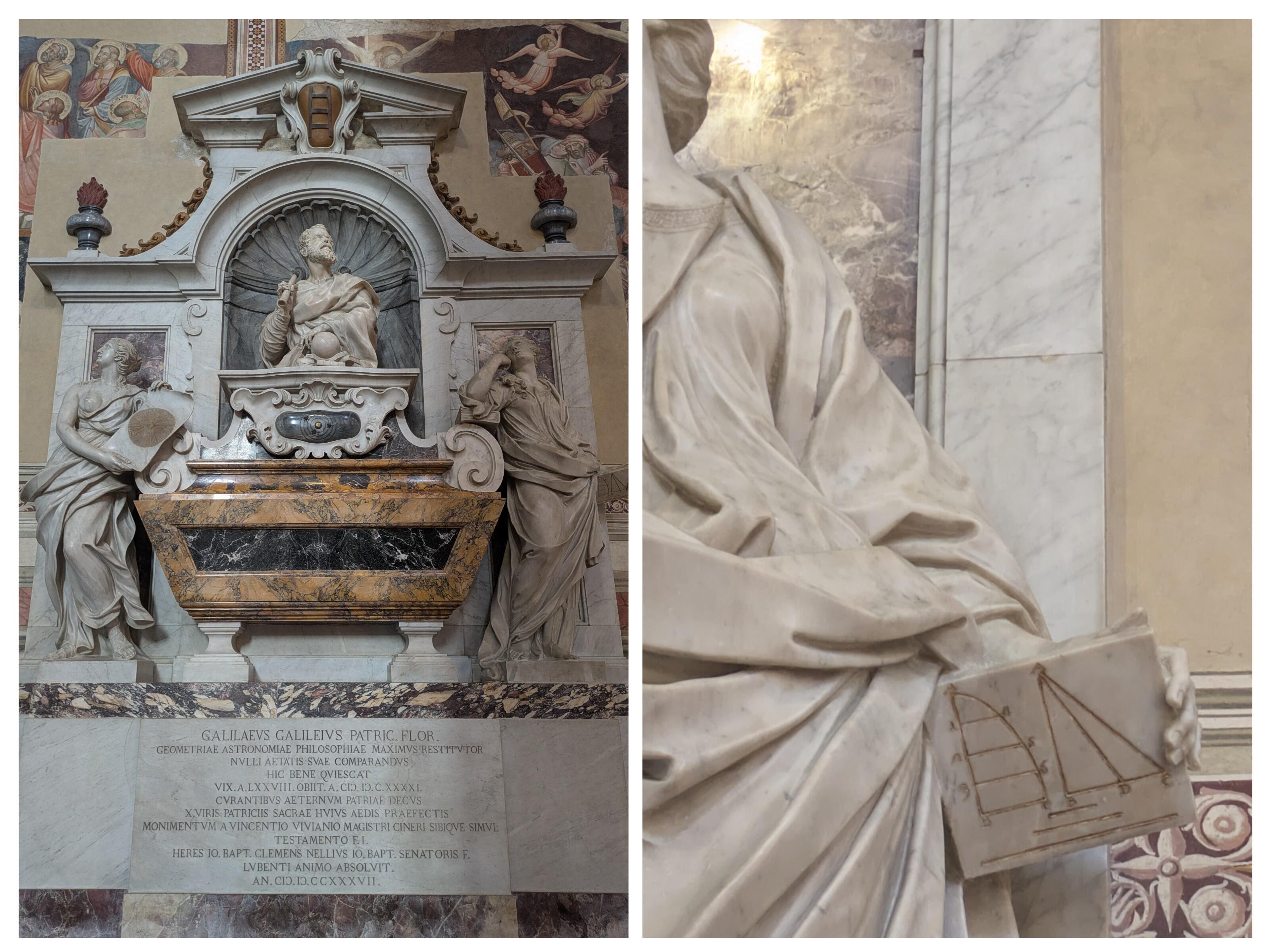 Le monumental tombeau de Galilée présente le savant tenant un télescope et entouré de deux statues allégoriques : l’Astronomie, à gauche, qui lève les yeux vers le ciel, et la Géométrie, à droite, tournée vers la terre, illustrant ainsi l’étendue de ses découvertes scientifiques.