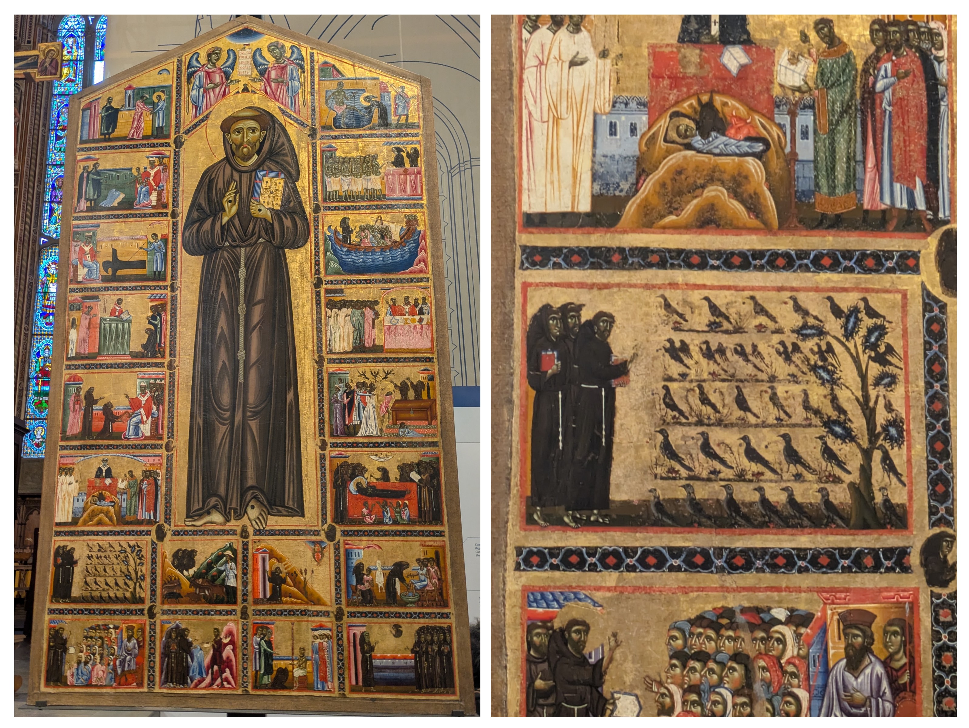 Notre fameux St François ! Ce panneau est la plus ancienne des peintures de Santa Croce ; il dépeint la vie de cette personnalité, antérieure aux fresques de la basilique d’Assise, tandis que son fond d’or témoigne de l’influence du style byzantin sur l’art médiéval. Cette œuvre inclut une scène rigolote où St François est en train de prêcher aux oiseaux.