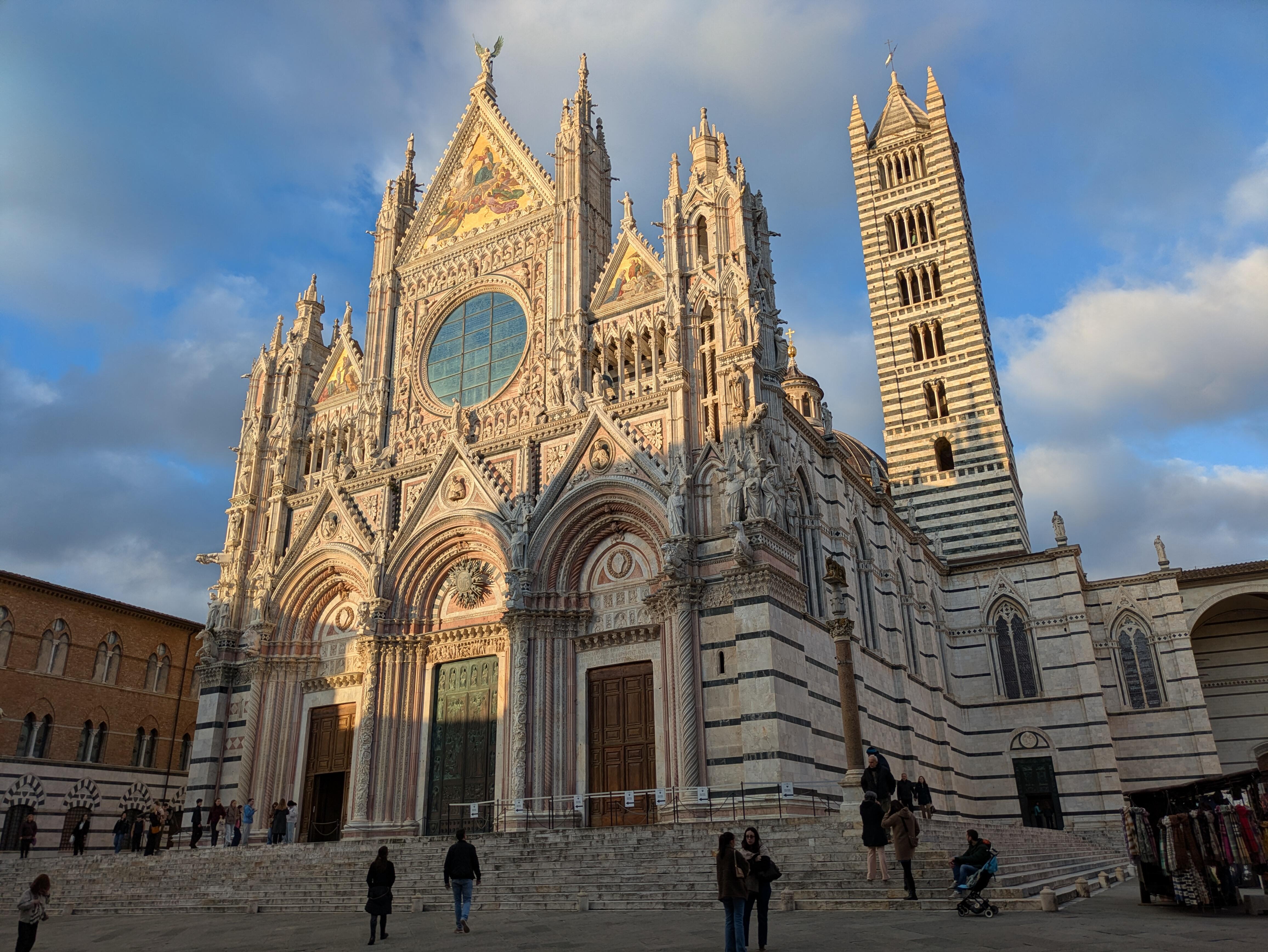 L’église de Sienne est magnifique et très décorée, avec ses murs typiquement recouverts de rayures de marbre blanc et noir. Malheureusement, on est arrivés trop tard pour visiter son intérieur, mais on a pu jeter un coup d’œil par la porte de la sortie.