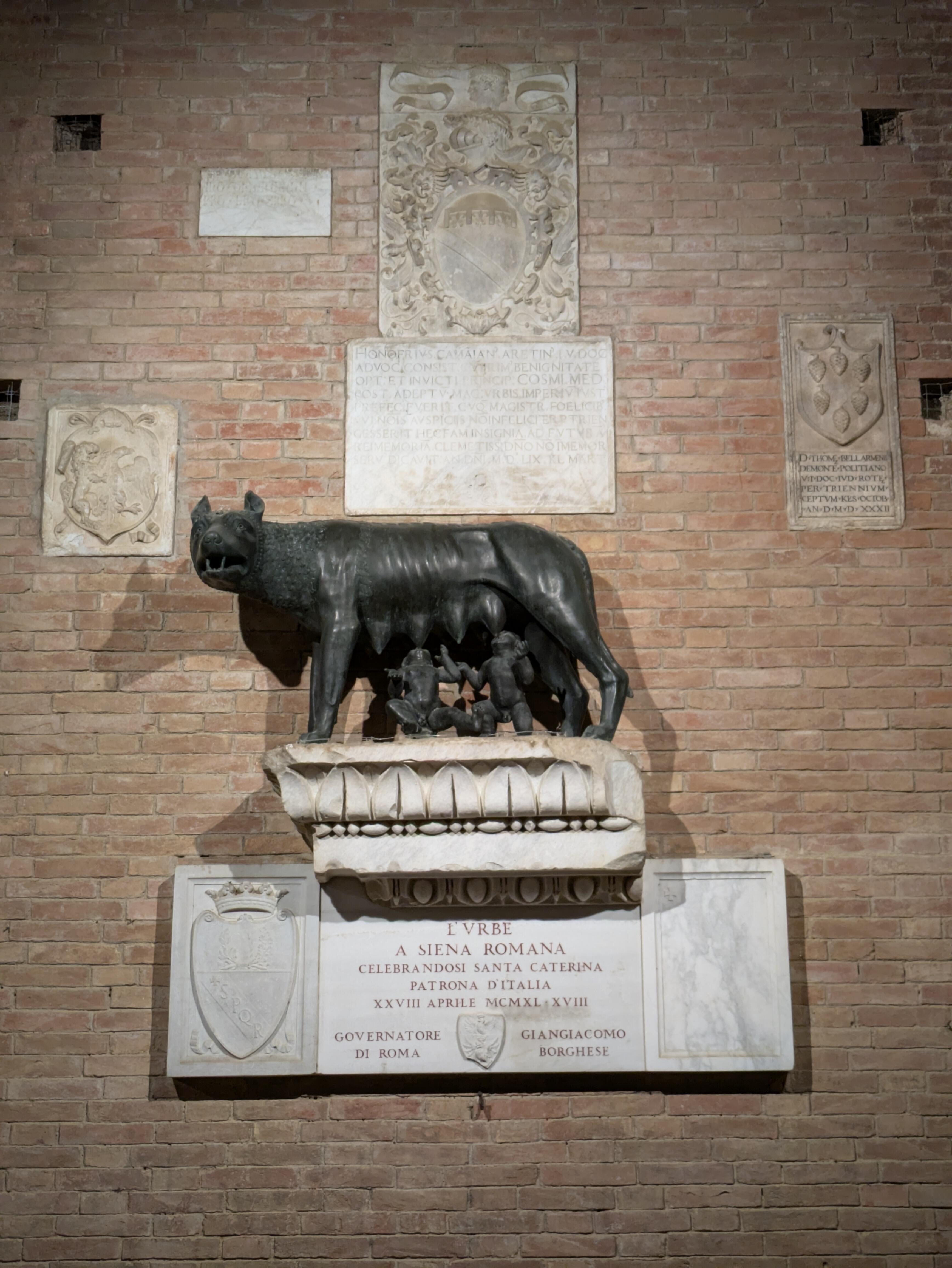 On a remarqué qu’il y a bien plus de statues de la Louve allaitant Romulus et Rémus à Sienne qu’à Rome. La cité aurait multiplié ces statues pour revendiquer avec fierté sa fondation mythique par les fils de Rémus, Senius et Aschius, érigeant ce symbole en un puissant instrument d’identité politique visant à affirmer sa légitimité et son égalité face à la puissance romaine et à sa rivale Florence.