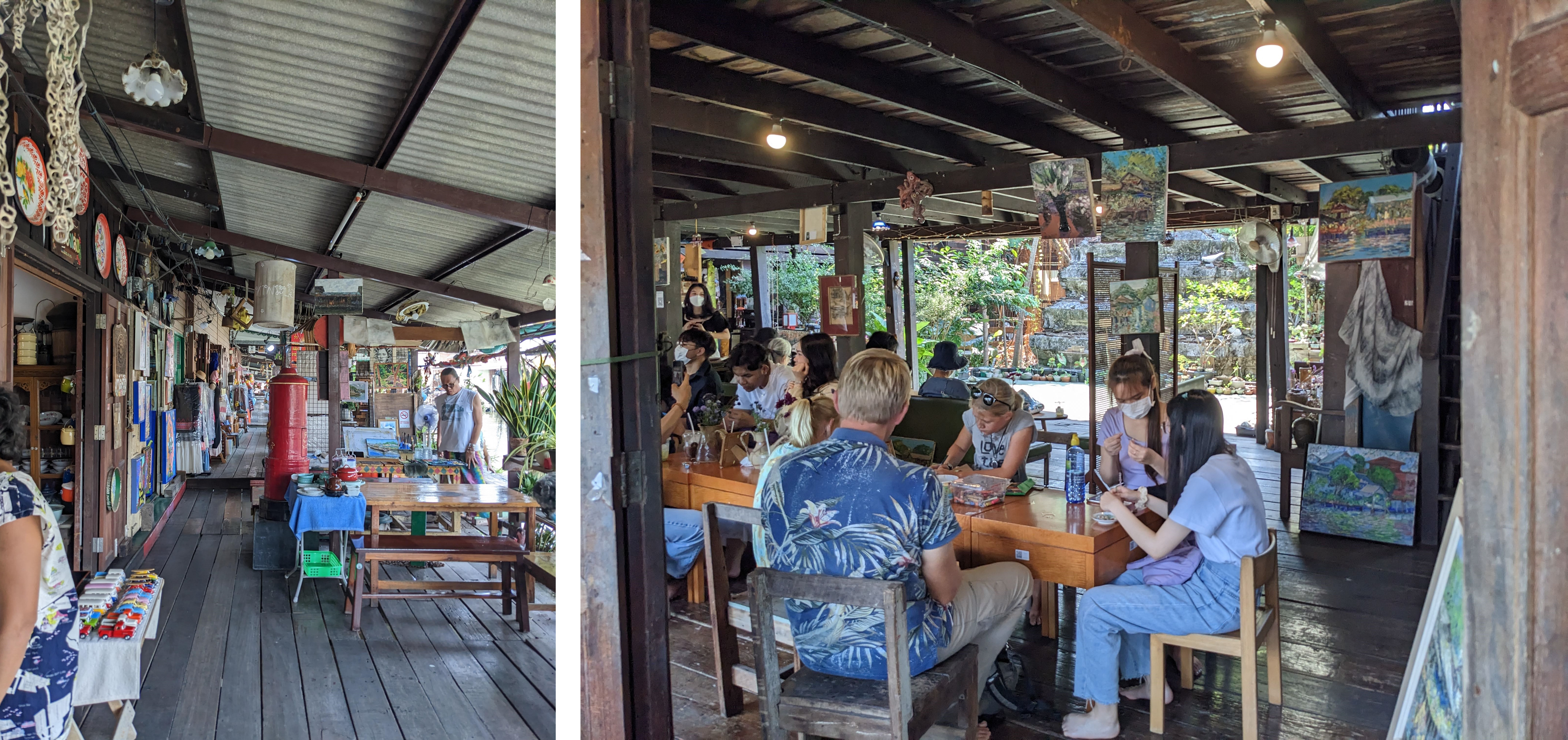 This is not a real floating market anymore, the shops are all in the riverside houses but not on boats. It is rather famous for its artistic scene. There is the Artist House, where you can buy or self made several stuff (paintings, jewellery, sculpture maybe)…