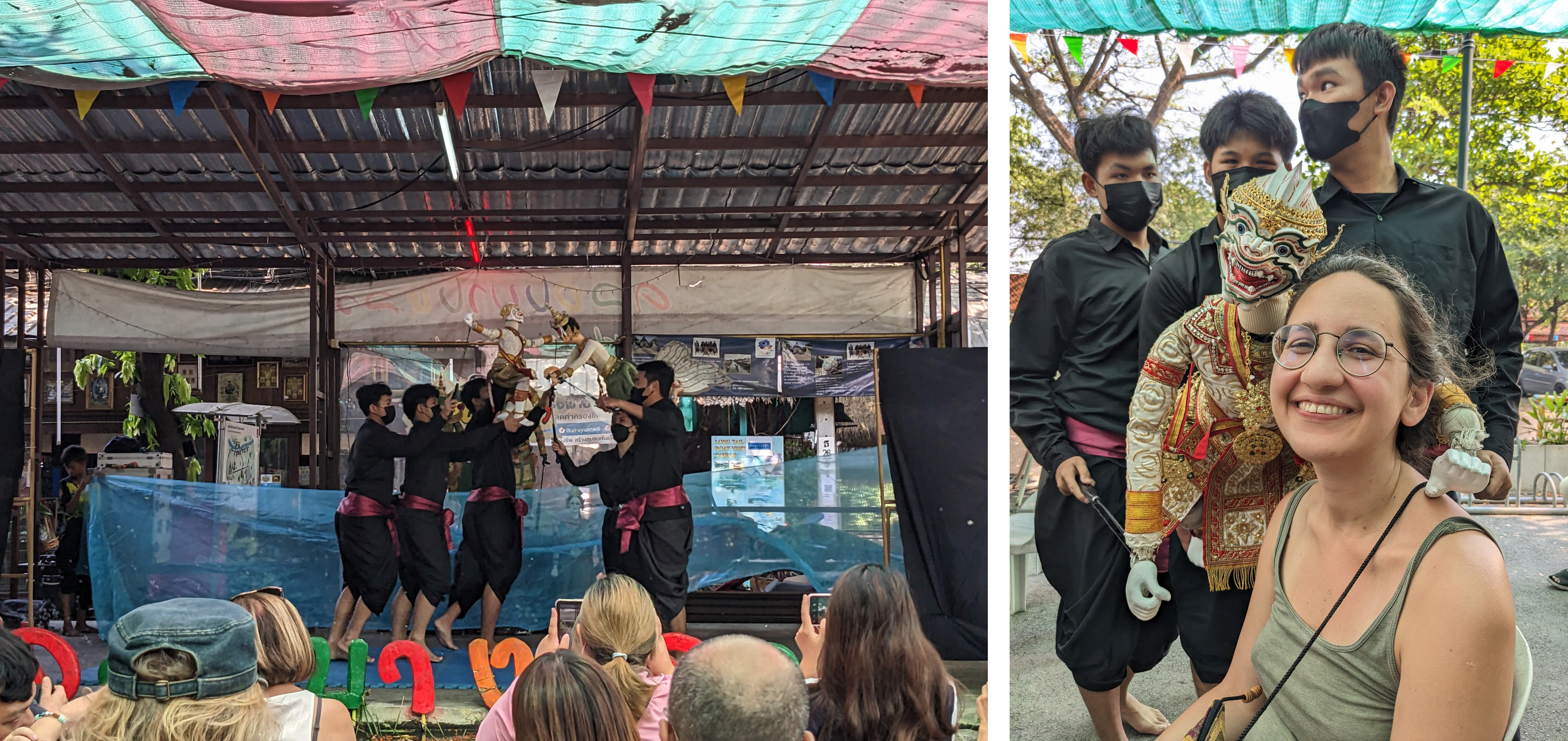 Each puppet, is controlled by two or three people with a rope and pulley system, which help make the puppet look as if it is gracefully dancing on stage. The shows are usually accompanied by both music and a narrator who normally tells a story derived from the Ramakien, the Thai version of the Hindu Ramayana, which we learned about in Kuala Lumpur already.