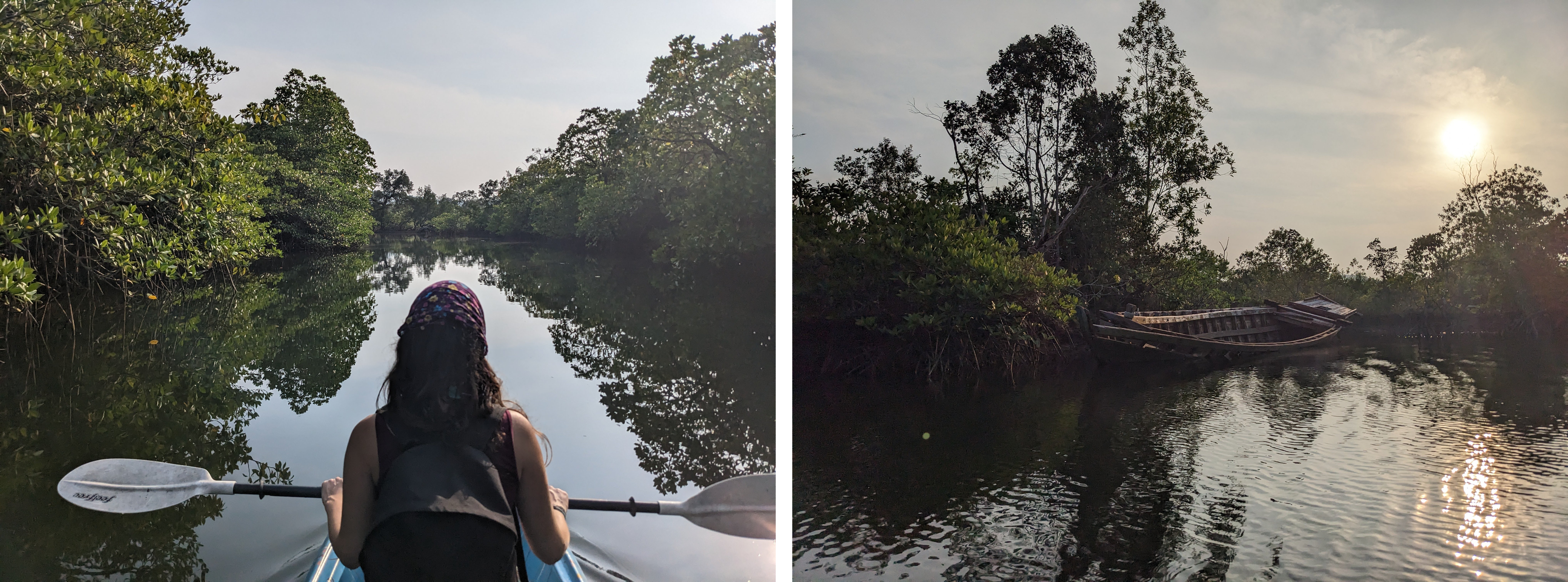 We made a small kayak excursion on the river going through our village. We went around the mangrove, and saw beautiful blue-coloured birds and abandoned ships: