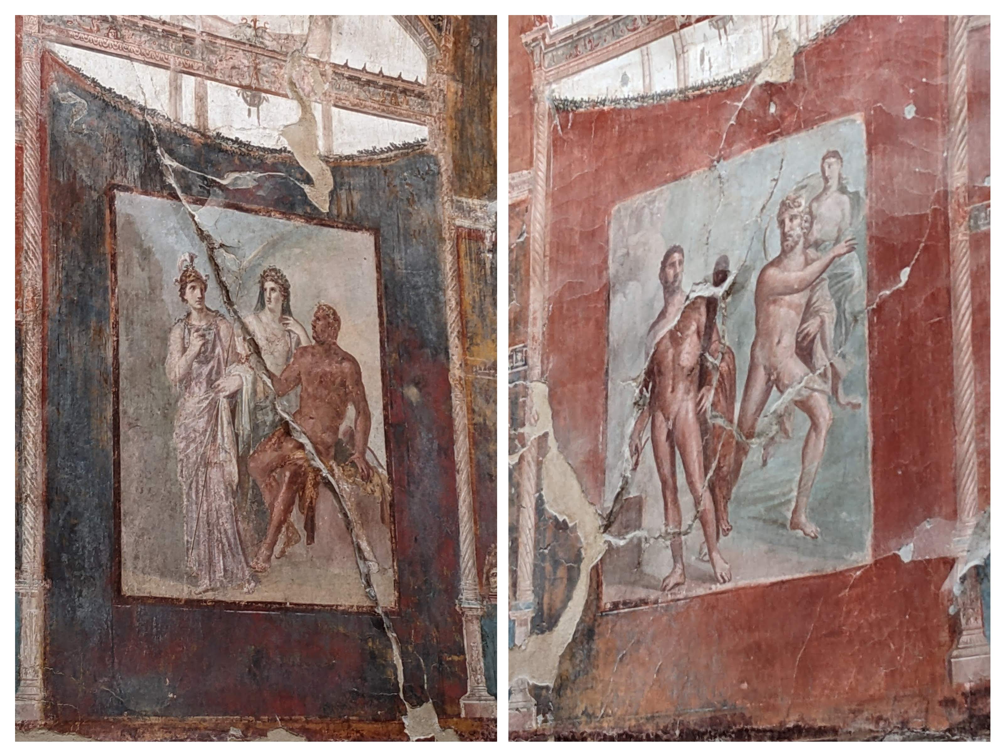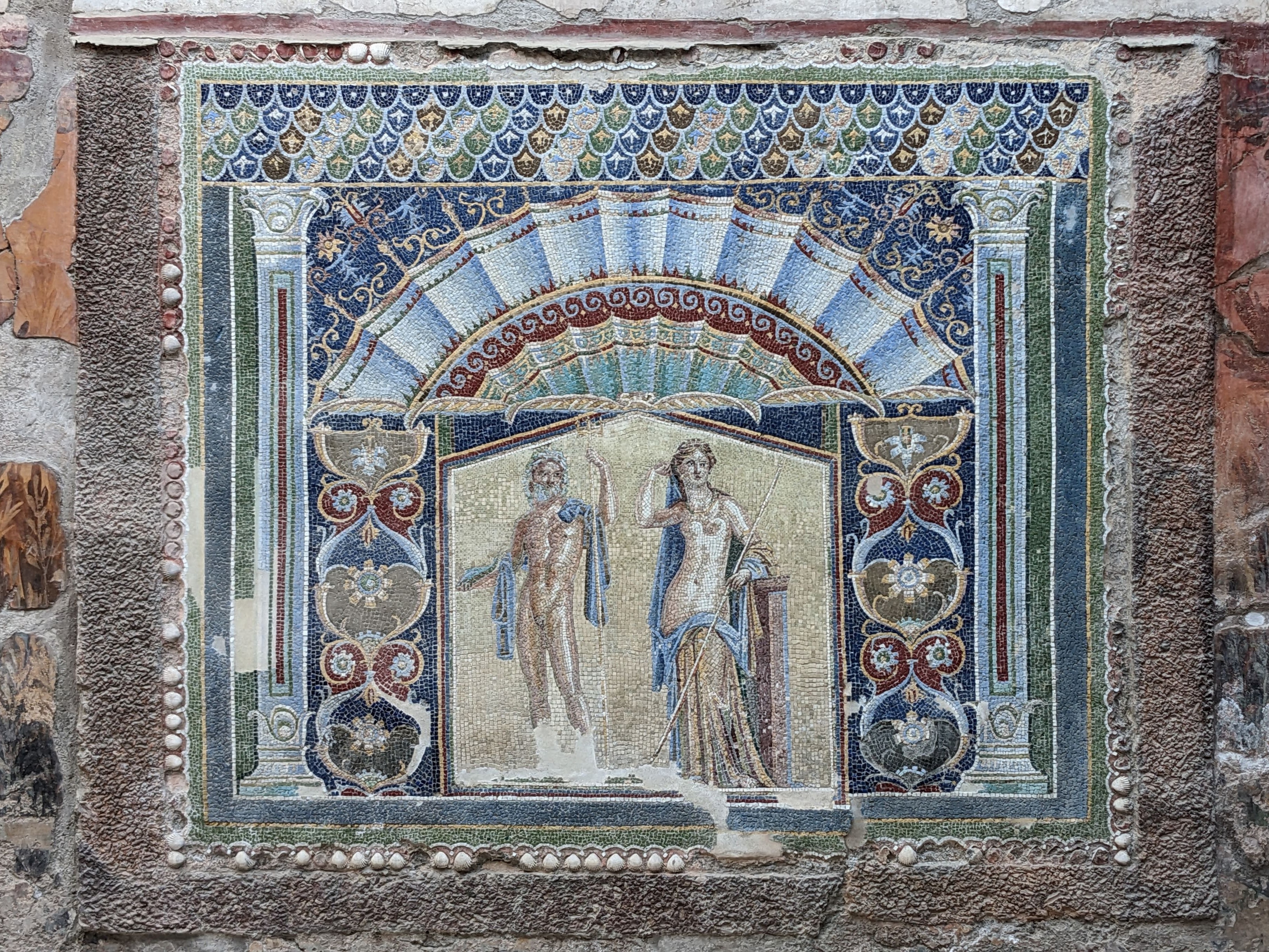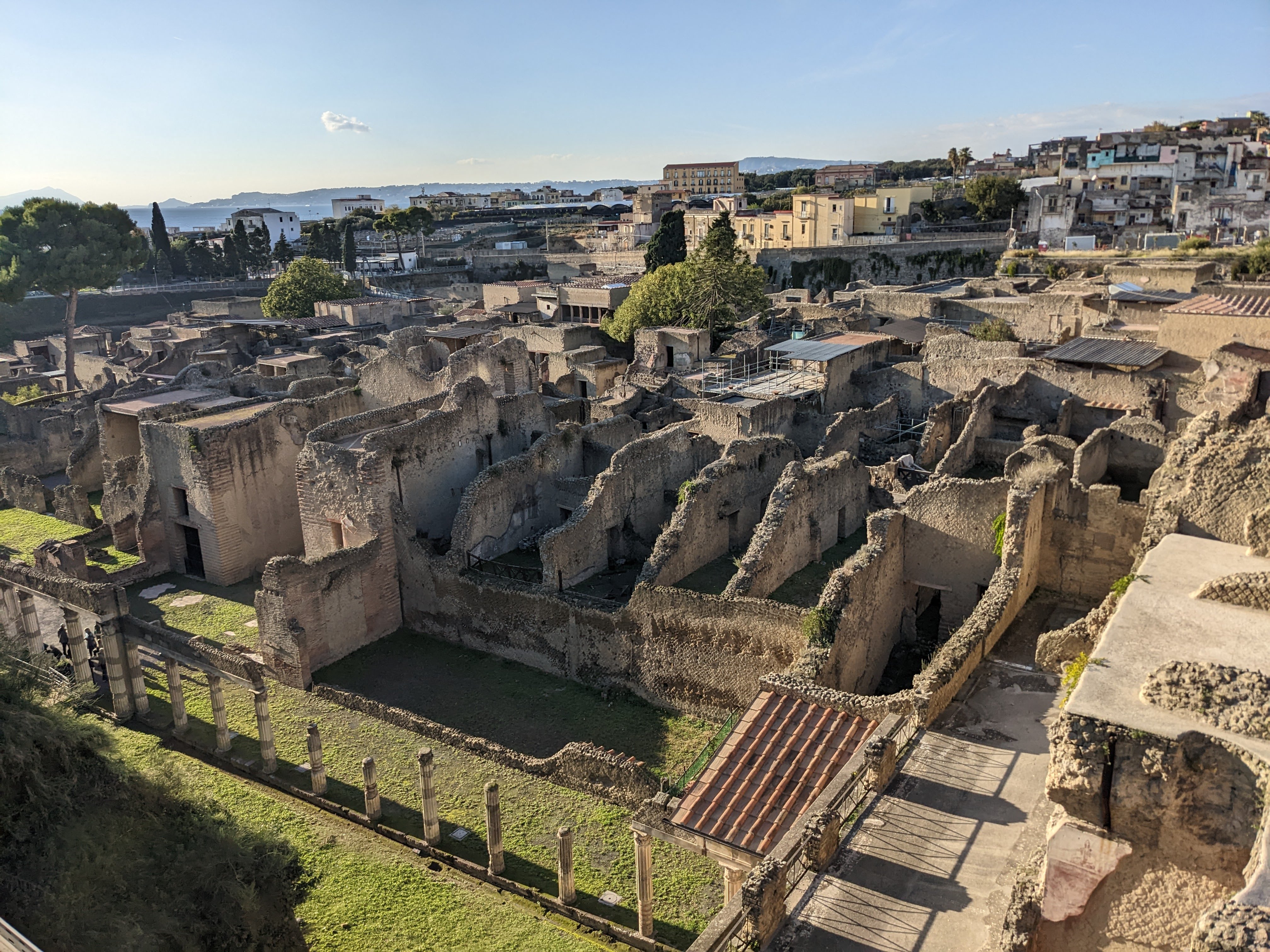 In fact, we were amazed how intact it was, it was likely the first time we saw the second floors of houses in an ancient town. It is due to the mainly pyroclastic material that covered Herculaneum (unlike Pompeii) carbonized and preserved more wood in objects such as roofs, beds, and doors, as well as other organic-based materials such as food and papyrus. Thanks to that it is also possible to see amazing frescos from that time.