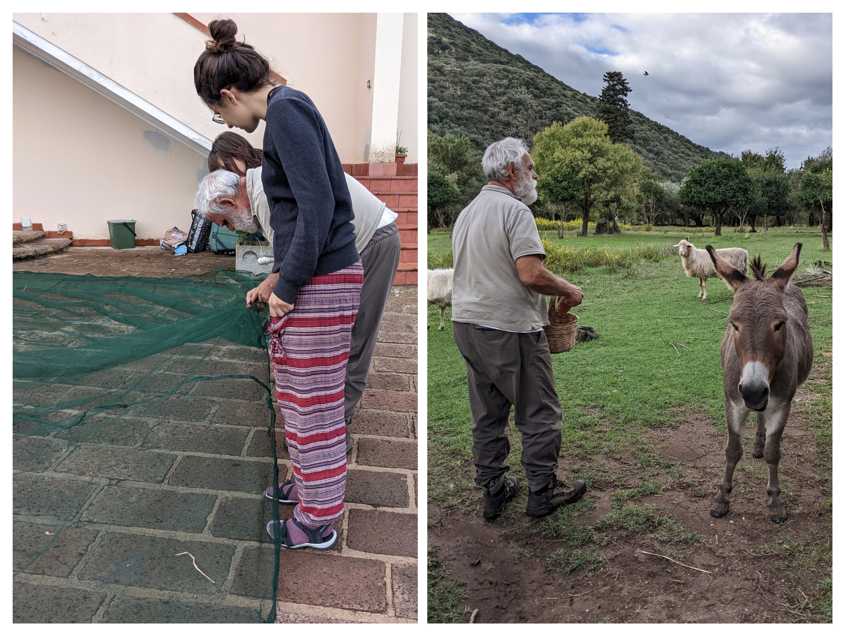 Today was our first day of work, it was quite a slow and easy start. Ece, with another helper Monica, had to check some large nets for holes. These nets will be used later to gather the olives from the trees! Louis took the road with Bruno to help him at various places. They went to the field where are located the olive trees, to harvest some tasty grapes. Then they went to another field, where Bruno fed the donkeys, the ducklings 🦆 and the chickens 🐔, the latter providing us in exchange some fresh eggs. At lunch we all gathered to eat some bass, which were fished by a friend of Bruno some days ago, a delight 😋